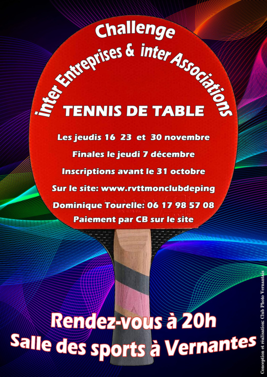 Notre tournoi Inter-entreprises, métiers et associations dont la première édition date de 2003 permet une pratique ponctuelle de notre sport par équipe de 3 joueurs. Suite à la réussite des années précédentes, nous organisons l'édition 2019 dans notre salle spécifique de tennis de table à VERNANTES. Le premier tour sera le jeudi 16 novembre, puis les 3 jeudis suivants, le 23 novembre, le 30 novembre et le 7 décembre.