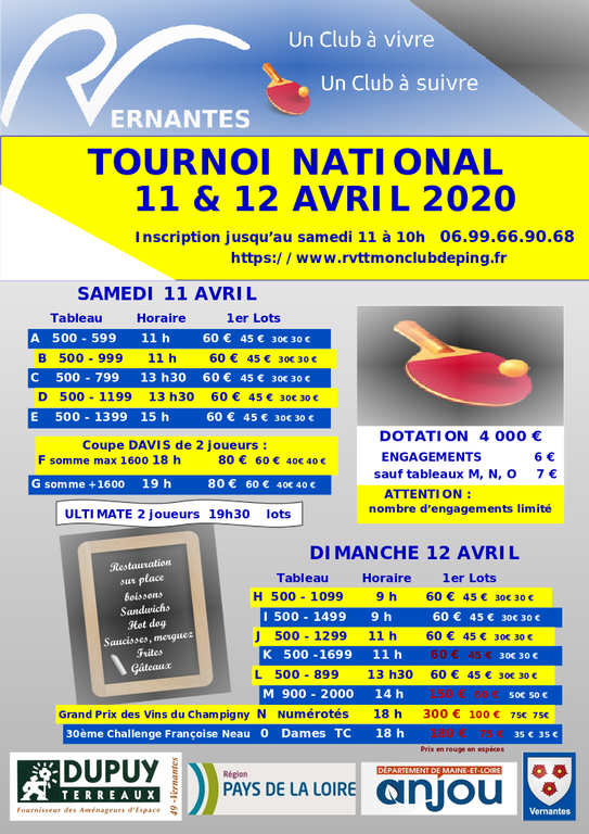 Tournoi national de tennis de table vernantes ouverture dans 15mn absence des juges arbitres parking sans voitures buvette sans clients salle aucun joueurs merci à nos partenaires institutionnels entreprises et commerçants du jamais vu depuis 1974... À l'année prochaine 3 et 4 avril 2021